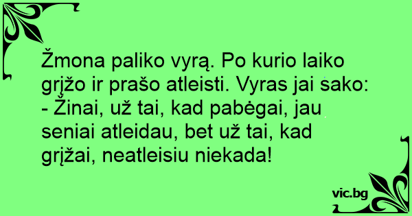 Žmona paliko vyrą. Po kurio laiko grįžo ir prašo atleisti. Vyras jai sako: