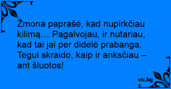 Žmona paprašė, kad nupirkčiau kilimą… Pagalvojau, ir nutariau, kad tai jai per didelė prabanga. Tegul skraido, kaip ir anksčiau – ant šluotos!