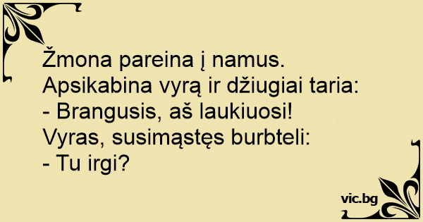 Žmona pareina į namus. Apsikabina vyrą ir džiugiai taria: