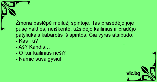 Žmona paslėpė meilužį spintoje. Tas prasėdėjo joje pusę nakties, neiškentė, užsidėjo kailinius ir pradėjo patyliukais kabarotis iš spintos. Čia vyras atsibudo:
