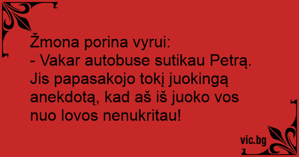 - Vakar autobuse sutikau Petrą. Jis papasakojo tokį juokingą anekdotą, kad aš iš juoko vos nuo lovos nenukritau!