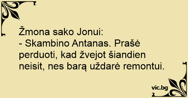 - Skambino Antanas. Prašė perduoti, kad žvejot šiandien neisit, nes barą uždarė remontui.