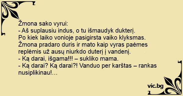 - Aš suplausiu indus, o tu išmaudyk dukterį.