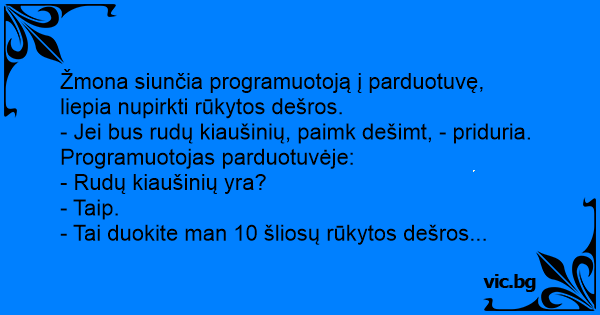 Žmona siunčia programuotoją į parduotuvę, liepia nupirkti rūkytos dešros.