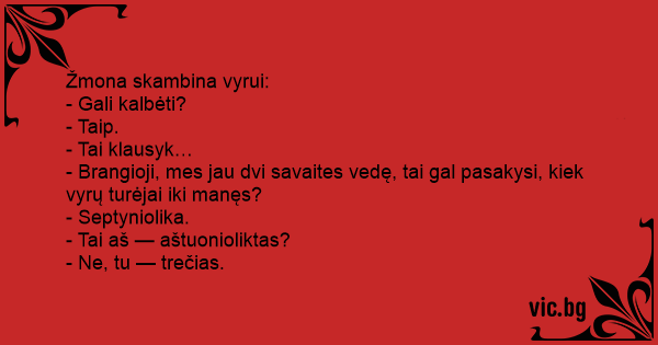 - Brangioji, mes jau dvi savaites vedę, tai gal pasakysi, kiek vyrų turėjai iki manęs?