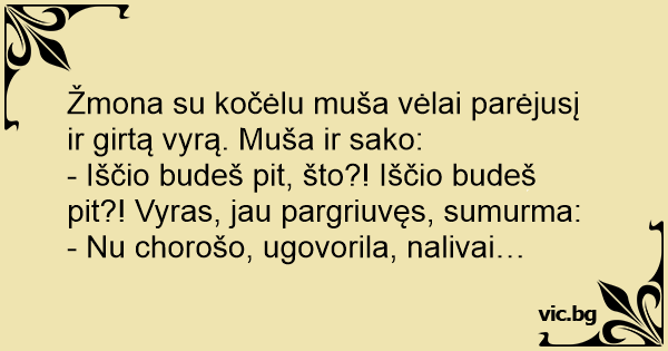 - Iščio budeš pit, što?! Iščio budeš pit?! Vyras, jau pargriuvęs, sumurma:
