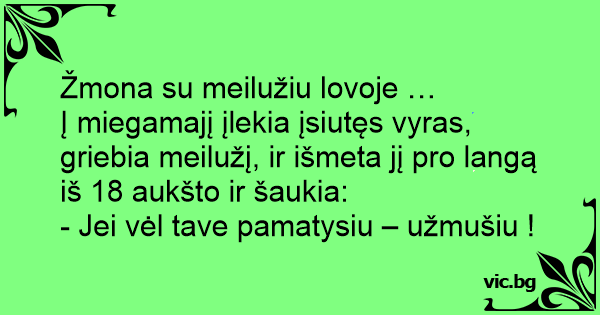 Į miegamajį įlekia įsiutęs vyras, griebia meilužį, ir išmeta jį pro langą iš 18 aukšto ir šaukia: