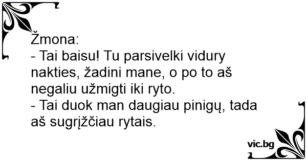 - Tai baisu! Tu parsivelki vidury nakties, žadini mane, o po to aš negaliu užmigti iki ryto.