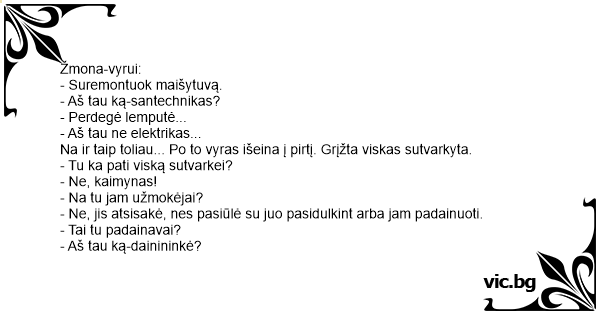 Na ir taip toliau... Po to vyras išeina į pirtį. Grįžta viskas sutvarkyta.