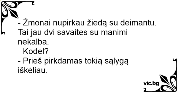 - Žmonai nupirkau žiedą su deimantu. Tai jau dvi savaites su manimi nekalba.