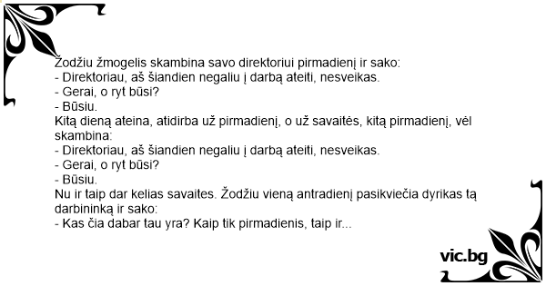 Nu ir taip dar kelias savaites. Žodžiu vieną antradienį pasikviečia dyrikas tą darbininką ir sako: