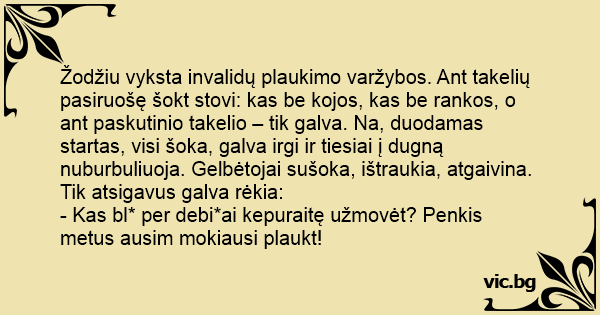 Žodžiu vyksta invalidų plaukimo varžybos. Ant takelių pasiruošę šokt stovi: kas be kojos, kas be rankos, o ant paskutinio takelio – tik galva. Na, duodamas startas, visi šoka, galva irgi ir tiesiai į dugną nuburbuliuoja. Gelbėtojai sušoka, ištraukia, atgaivina. Tik atsigavus galva rėkia: