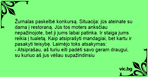 Žurnalas paskelbė konkursą. Situacija: jūs ateinate su dama į restoraną. Jūs tos moters anksčiau nepažinojote, bet ji jums labai patinka. Ir staiga jums reikia į tualetą. Kaip atsiprašyti mandagiai, bet kartu ir pasakyti teisybę. Laimėjo toks atsakymas: