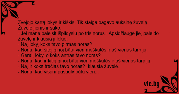 - Jei mane paleisit išpildysiu po tris norus.- Apsidžiaugė jie, paleido žuvelę ir klausia ji lokio: