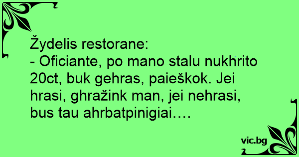 - Oficiante, po mano stalu nukhrito 20ct, buk gehras, paieškok. Jei hrasi, ghražink man, jei nehrasi, bus tau ahrbatpinigiai….