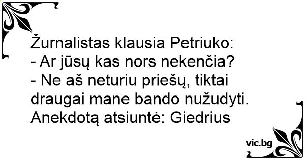 - Ne aš neturiu priešų, tiktai draugai mane bando nužudyti. Anekdotą atsiuntė: Giedrius