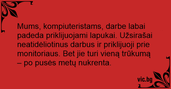 Mums, kompiuteristams, darbe labai padeda priklijuojami lapukai. Užsirašai neatidėliotinus darbus ir priklijuoji prie monitoriaus. Bet jie turi vieną trūkumą – po pusės metų nukrenta.