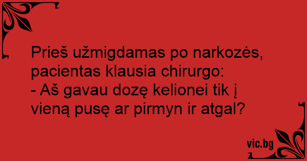 Prieš užmigdamas po narkozės, pacientas klausia chirurgo: