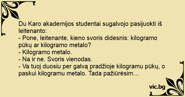 - Pone, leitenante, kieno svoris didesnis: kilogramo pūkų ar kilogramo metalo?
