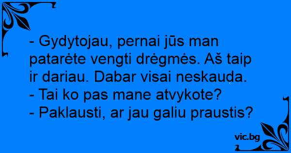 - Gydytojau, pernai jūs man patarėte vengti drėgmės. Aš taip ir dariau. Dabar visai neskauda.