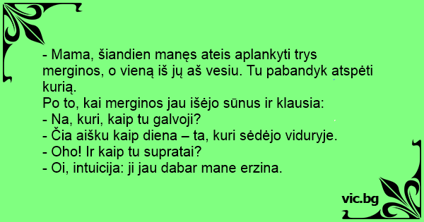 - Mama, šiandien manęs ateis aplankyti trys merginos, o vieną iš jų aš vesiu. Tu pabandyk atspėti kurią.