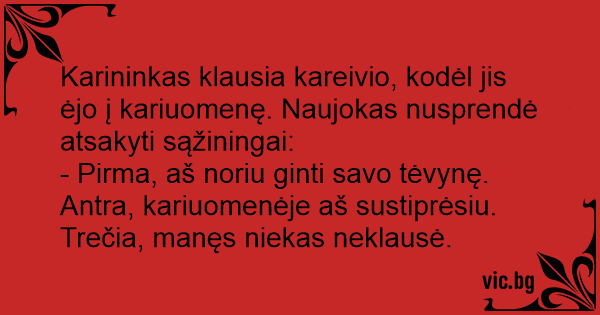 Karininkas klausia kareivio, kodėl jis ėjo į kariuomenę. Naujokas nusprendė atsakyti sąžiningai: