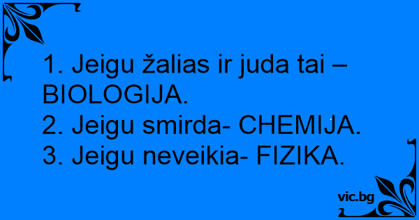 1. Jeigu žalias ir juda tai – BIOLOGIJA. 2. Jeigu smirda- CHEMIJA. 3. Jeigu neveikia- FIZIKA.