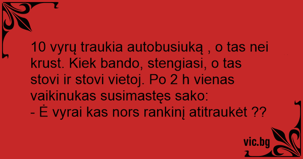 10 vyrų traukia autobusiuką , o tas nei krust. Kiek bando, stengiasi, o tas stovi ir stovi vietoj. Po 2 h vienas vaikinukas susimastęs sako: