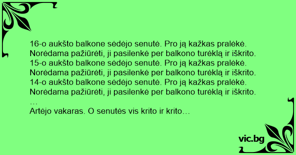 14-o aukšto balkone sėdėjo senutė. Pro ją kažkas pralėkė. Norėdama pažiūrėti, ji pasilenkė per balkono turėklą ir iškrito.