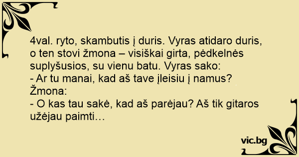 4val. ryto, skambutis į duris. Vyras atidaro duris, o ten stovi žmona – visiškai girta, pėdkelnės suplyšusios, su vienu batu. Vyras sako: