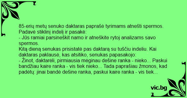 85-erių metų senuko daktaras paprašė tyrimams atnešti spermos. Padavė stiklinį indelį ir pasakė: