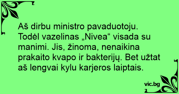 Aš dirbu ministro pavaduotoju. Todėl vazelinas „Nivea“ visada su manimi. Jis, žinoma, nenaikina prakaito kvapo ir bakterijų. Bet užtat aš lengvai kylu karjeros laiptais.