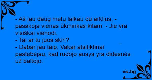 - Aš jau daug metų laikau du arklius, - pasakoja vienas ūkininkas kitam. - Jie yra visiškai vienodi.