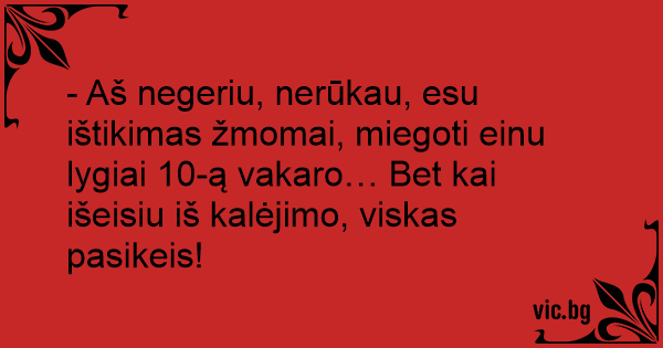 - Aš negeriu, nerūkau, esu ištikimas žmomai, miegoti einu lygiai 10-ą vakaro… Bet kai išeisiu iš kalėjimo, viskas pasikeis!