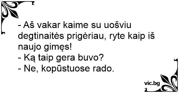 - Aš vakar kaime su uošviu degtinaitės prigėriau, ryte kaip iš naujo gimęs!