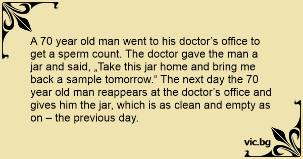 A 70 year old man went to his doctor’s office to get a sреrм count. The doctor gave the man a jar and said, „Take this jar home and bring me back a sample tomorrow.“ The next day the 70 year old man reappears at the doctor’s office and gives him the jar, which is as clean and empty as on – the previous day.