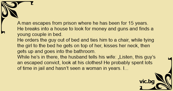 While he’s in there, the husband tells his wife: „Listen, this guy’s an escaped convict, look at his clothes! He probably spent lots of time in jail and hasn’t seen a woman in years. I saw how he kissed your neck.“ If he wants s*x, don’t resist, don’t complain, do whatever he tells you. Satisfy him no matter how much he nauseates you. This guy is probably very dangerous. If he gets angry, he’ll k*ll us. Be strong, honey. I love you.“