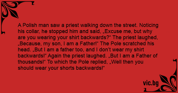 A Polish man saw a priest walking down the street. Noticing his collar, he stopped him and said, „Excuse me, but why are you wearing your shirt backwards?“ The priest laughed, „Because, my son, I am a Father!“ The Pole scratched his head. „But I am a father too, and I don’t wear my shirt backwards!“ Again the priest laughed. „But I am a Father of thousands!“ To which the Pole replied, „Well then you should wear your shorts backwards!“