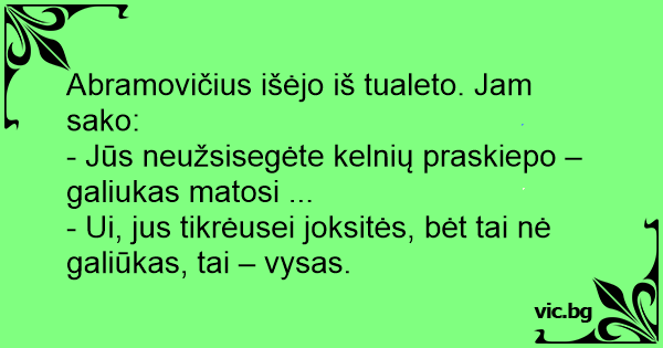 - Ui, jus tikrėusei joksitės, bėt tai nė galiūkas, tai – vysas.