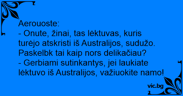 - Onute, žinai, tas lėktuvas, kuris turėjo atskristi iš Australijos, sudužo. Paskelbk tai kaip nors delikačiau?