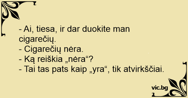 - Ai, tiesa, ir dar duokite man cigarečių. - Cigarečių nėra. - Ką reiškia „nėra“? - Tai tas pats kaip „yra“, tik atvirkščiai.