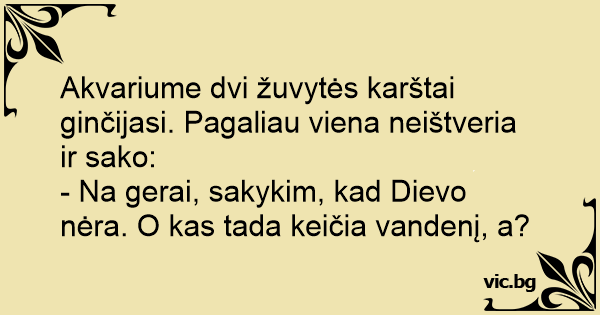 Akvariume dvi žuvytės karštai ginčijasi. Pagaliau viena neištveria ir sako: