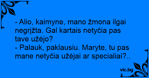 - Alio, kaimyne, mano žmona ilgai negrįžta. Gal kartais netyčia pas tave užėjo?