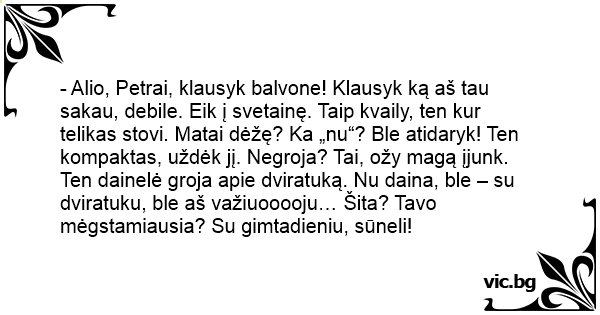 - Alio, Petrai, klausyk balvone! Klausyk ką aš tau sakau, debile. Eik į svetainę. Taip kvaily, ten kur telikas stovi. Matai dėžę? Ka „nu“? Ble atidaryk! Ten kompaktas, uždėk jį. Negroja? Tai, ožy magą įjunk. Ten dainelė groja apie dviratuką. Nu daina, ble – su dviratuku, ble aš važiuooooju… Šita? Tavo mėgstamiausia? Su gimtadieniu, sūneli!