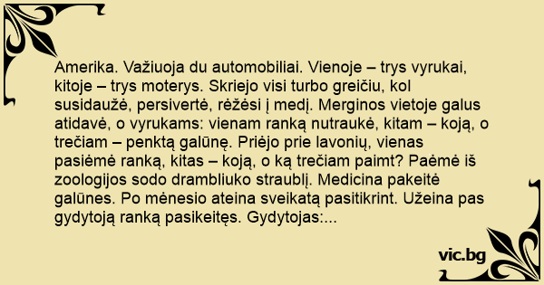 Amerika. Važiuoja du automobiliai. Vienoje – trys vyrukai, kitoje – trys moterys. Skriejo visi turbo greičiu, kol susidaužė, persivertė, rėžėsi į medį. Merginos vietoje galus atidavė, o vyrukams: vienam ranką nutraukė, kitam – koją, o trečiam – penktą galūnę. Priėjo prie lavonių, vienas pasiėmė ranką, kitas – koją, o ką trečiam paimt? Paėmė iš zoologijos sodo drambliuko straublį. Medicina pakeitė galūnes. Po mėnesio ateina sveikatą pasitikrint. Užeina pas gydytoją ranką pasikeitęs. Gydytojas: