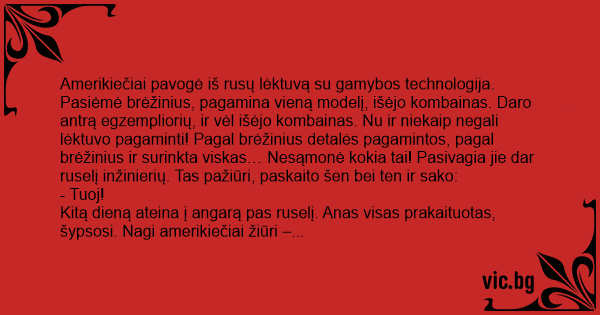 Amerikiečiai pavogė iš rusų lėktuvą su gamybos technologija. Pasiėmė brėžinius, pagamina vieną modelį, išėjo kombainas. Daro antrą egzempliorių, ir vėl išėjo kombainas. Nu ir niekaip negali lėktuvo pagaminti! Pagal brėžinius detalės pagamintos, pagal brėžinius ir surinkta viskas… Nesąmonė kokia tai! Pasivagia jie dar ruselį inžinierių. Tas pažiūri, paskaito šen bei ten ir sako: