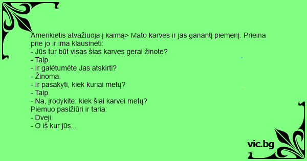 Amerikietis atvažiuoja į kaimą> Mato karves ir jas ganantį piemenį. Prieina prie jo ir ima klausinėti: