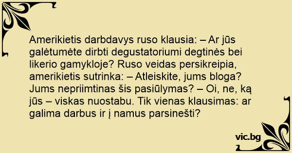 Amerikietis darbdavys ruso klausia: – Ar jūs galėtumėte dirbti degustatoriumi degtinės bei likerio gamykloje? Ruso veidas persikreipia, amerikietis sutrinka: – Atleiskite, jums bloga? Jums nepriimtinas šis pasiūlymas? – Oi, ne, ką jūs – viskas nuostabu. Tik vienas klausimas: ar galima darbus ir į namus parsinešti?