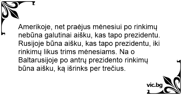 Amerikoje, net praėjus mėnesiui po rinkimų nebūna galutinai aišku, kas tapo prezidentu. Rusijoje būna aišku, kas tapo prezidentu, iki rinkimų likus trims mėnesiams. Na o Baltarusijoje po antrų prezidento rinkimų būna aišku, ką išrinks per trečius.