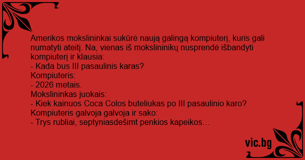 Amerikos mokslininkai sukūrė naują galingą kompiuterį, kuris gali numatyti ateitį. Na, vienas iš mokslininikų nusprendė išbandyti kompiuterį ir klausia:
